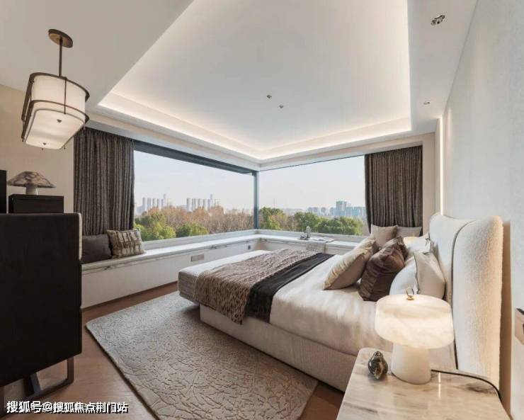 建面约190方的户型,更是在主卧做了敞亮的无柱转角窗,有270°基本没遮挡的视野,可以直接坐在飘窗上,坐在客厅的落地窗前,看着外面堪比度假酒店的景观。