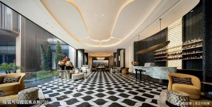 门头「高、阔、深」,高度约9.5米,宽度约66米,深度就像一座小广场,门口的奢石、水景,头顶的透光云石,都是Plus版。