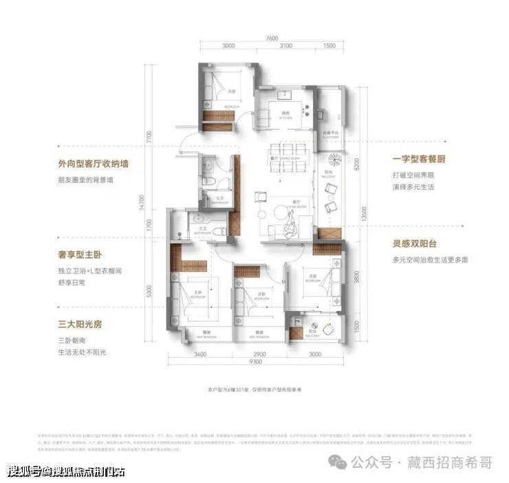 A1挽风(96㎡):三室两厅两卫,南向采光约9.4米,多功能阳台。