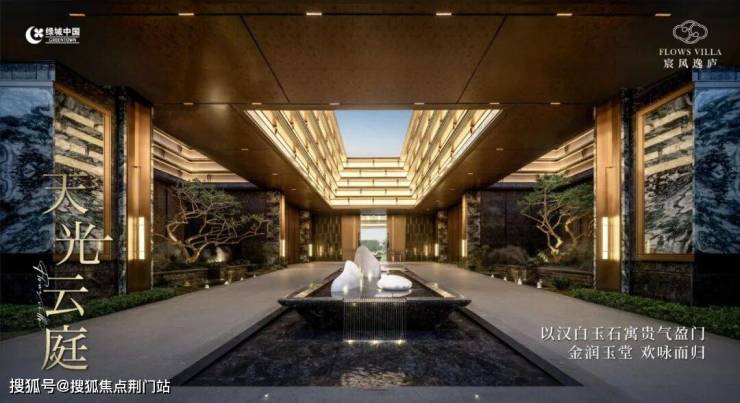 主入口“浮玉映宸”高达9.5米,取意“九五登峰”,建筑形制上参考官帽,设计十分考究。两侧以“翠谷幽兰”奢石点睛,地面精选“砂岩流水”水纹通铺,“四水归堂”的归家礼序,承载着对生活“步步登高”的美好期许。