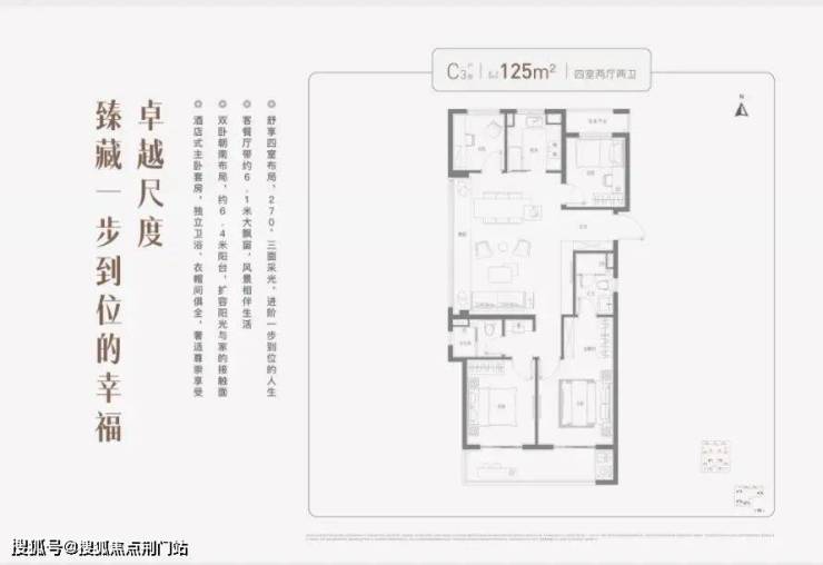 建面约125㎡的改善四房与建面约112㎡的格局很相似,但整体尺度空间更为奢侈,非常适合二胎家庭或三代同堂。