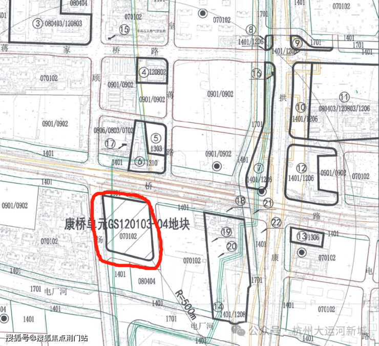 规划图还公布了地块周边500米范围内的市政设施图,地块北侧,未来规划为康良快速路,可以看到应该是地下快速路隧道口,就位于顾阳路与康桥路交叉口;