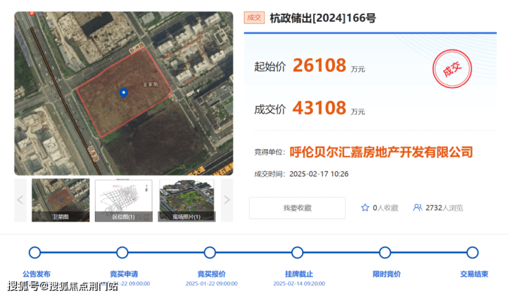 2月14日,该地块经过35轮报价,最终由竞买人呼伦贝尔汇嘉房地产开发有限公司43108万元总价竞得,楼面价15686.47元/平方米,溢价率65.11%。