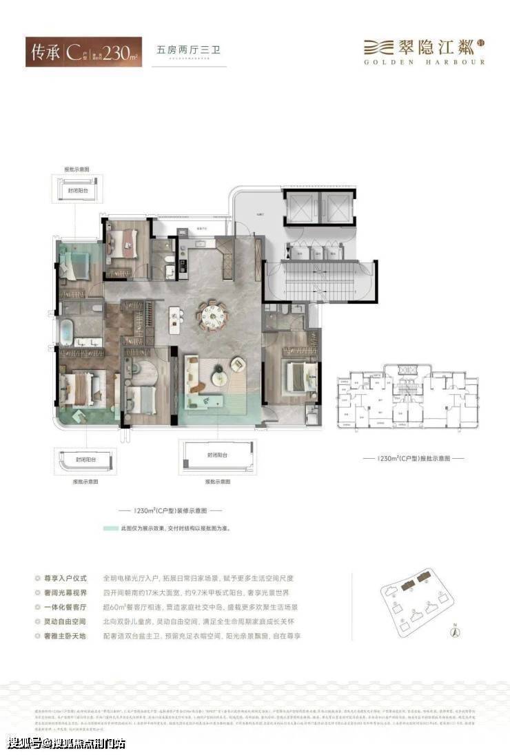 建面约185平户型,打造四房双套房三卫;建面约230平户型,则是做了市中心难得的五房双套房三卫设计。