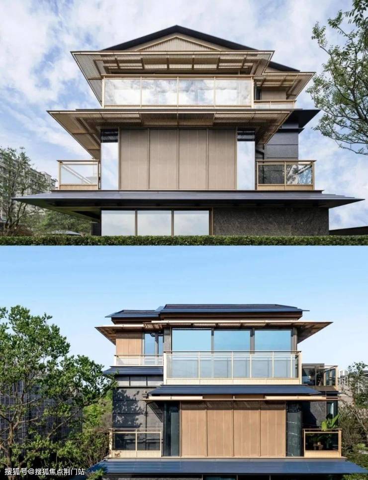 在立面打造上,提取“宋画”中的线条感,提取歇山顶样式,转译形成深远的挑檐,在视觉效果上给人以棱角分明、结构清晰之感,整体呈现一种清雅内敛的当代气质,大尺度巨幕玻璃窗镶嵌金色铝线条,如画框一般,攫住窗外的每一寸风景,让建筑隐于自然