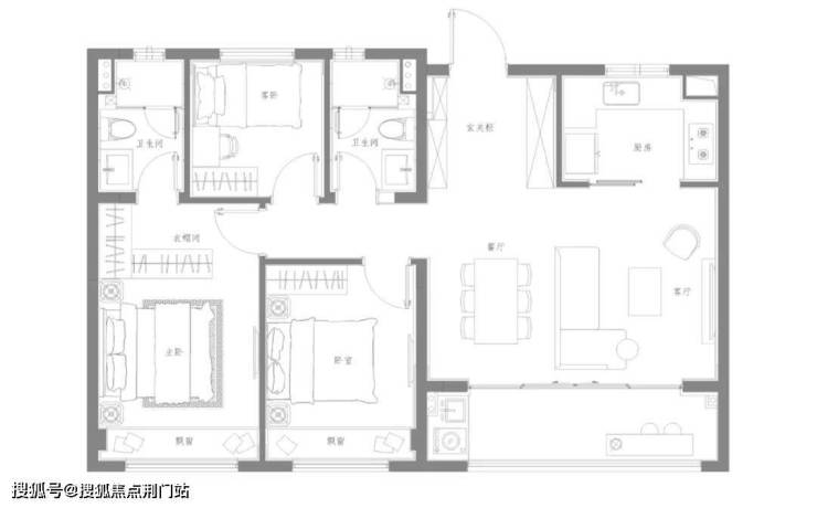 尤其是这款约106㎡三房两卫,单看功能和尺度,就知道又是爆款神户型。布局上罕见做到了 四开间朝南,南向总面宽约11.7米!