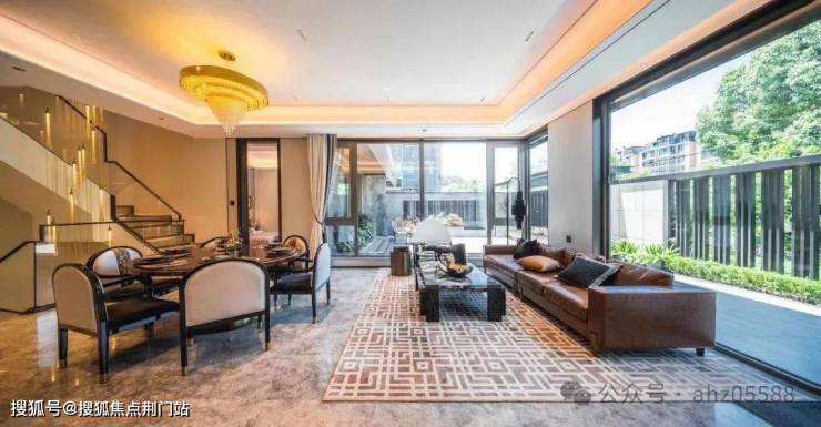 建面约245方的江山合院,整体5室2厅6卫。L型围合出私密独享内庭院;南向超大面宽更是超过了17米。为了追求即时采光面和开阔的观景视野,设计团队落地打造了270度环幕全景窗设计,自此在室内便可将一园四季美景尽收眼底。