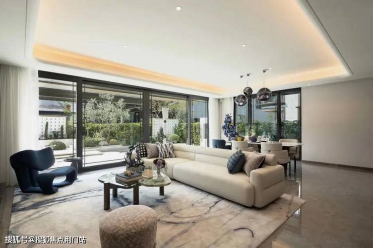 从当代艺术馆到板块唯一的国标恒温泳池、健身房、瑜伽室,溪映听庐的听庐雅舍使用了大量的玉石和金属,雅奢的质感拉满。