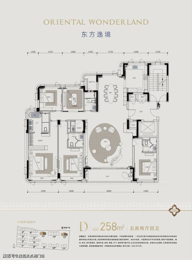 客厅、阳台尺度都非常阔绰,建面约258方户型超级客厅的面积达到近90方,中西餐厨一类的延展功能界面更优秀。