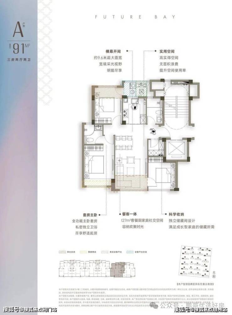 ◎横幕开间:约27㎡客餐厅,约9.6m超大面宽,宽境采光视野◎U型厨房设计:操作动线流畅,可容纳多人协作◎真三房+真南北通透:北侧无消防连廊,实现纯粹南北对流。三开间朝南,最小卧室面积近9㎡,所有卧室面宽均达3米以上。