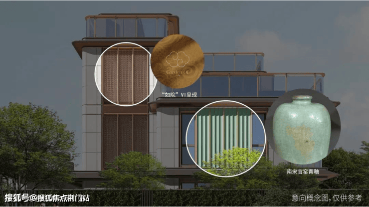 将故宫博物院收藏的《四季山水图》避风䈋装饰构件提炼出来,镶嵌在立面上,完美展示古典张力和现代艺术气质。