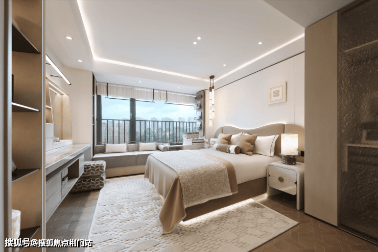 在春来晴翠园建面约169㎡晴翠户型中,最亮眼的设计显而易见——主卧90°转角窗,揽获270°环幕视野,将天光云影尽纳室内。不仅引入绝佳采光与风景,更成为一处心灵栖所。