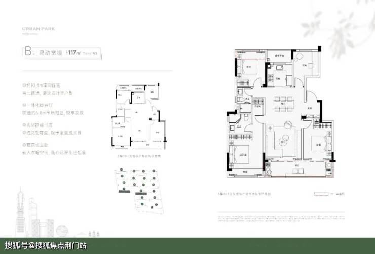 如果预算允许,可以直接117方四房改善。 建面约117方四房两厅两卫户型,为标准的四叶草布局,空间尺度更为阔绰。三开间朝南面宽达到了约10.4米,客厅与次卧贯通的长阳台近6.8米长,不仅通风采光更好,也为晾晒、花草养护等提供了更多的生活情趣。