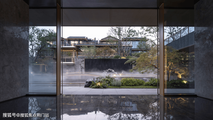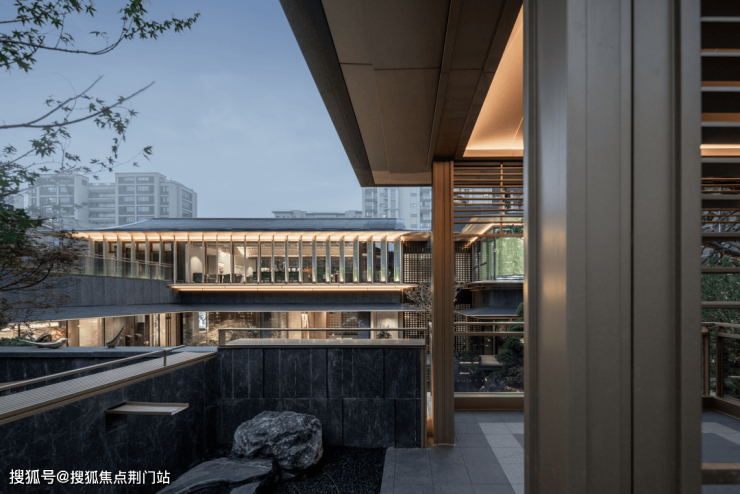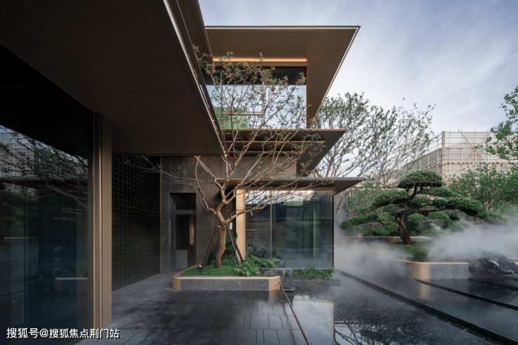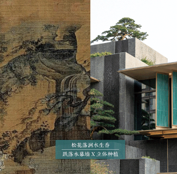 在公区入口,建筑师提取画中的山石、流水、楼阁、青松等元素意象,将之分别转译为建筑的基座、立面、屋面、景观小品等空间要素。“以筑为画”——以建筑的空间要素来重新绘就一幅“可实景体验的山水画”,并借助曲径通幽的动线设计进一步引人入画。在路径视角、环境感知的变化中,实现了画意与空间的第一步转换。