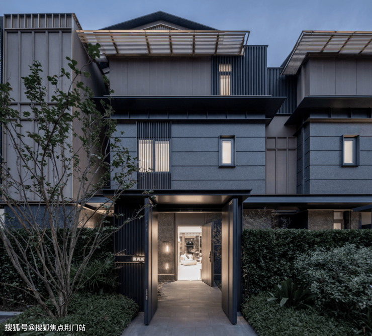 院墅的立面材质选择石材、铝材、玻璃为主体,辅以仿木纹涂料并嵌入发泡陶瓷线条,通过木作样式与木质质感的饰面表现,增添构造的层次感与品质感。