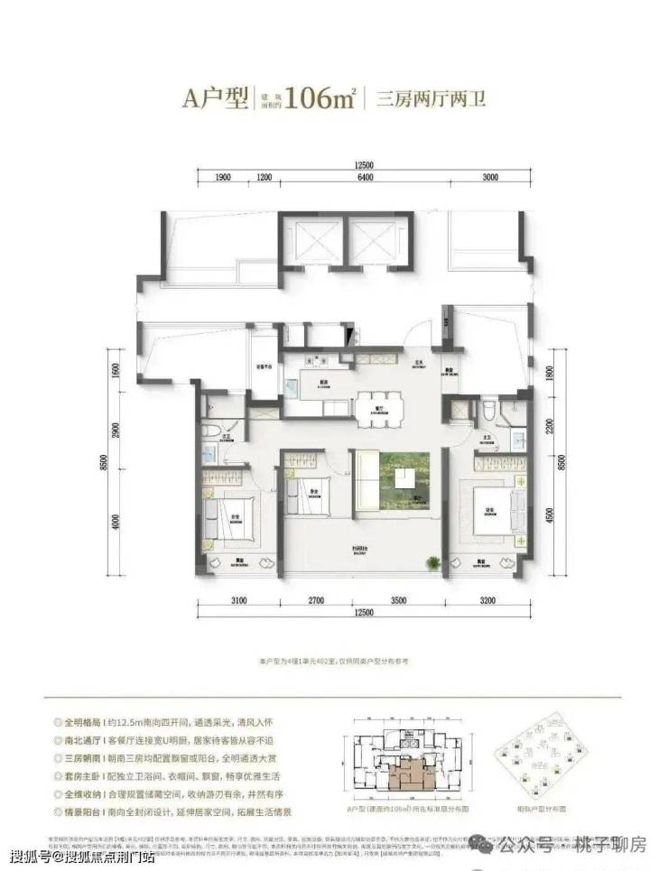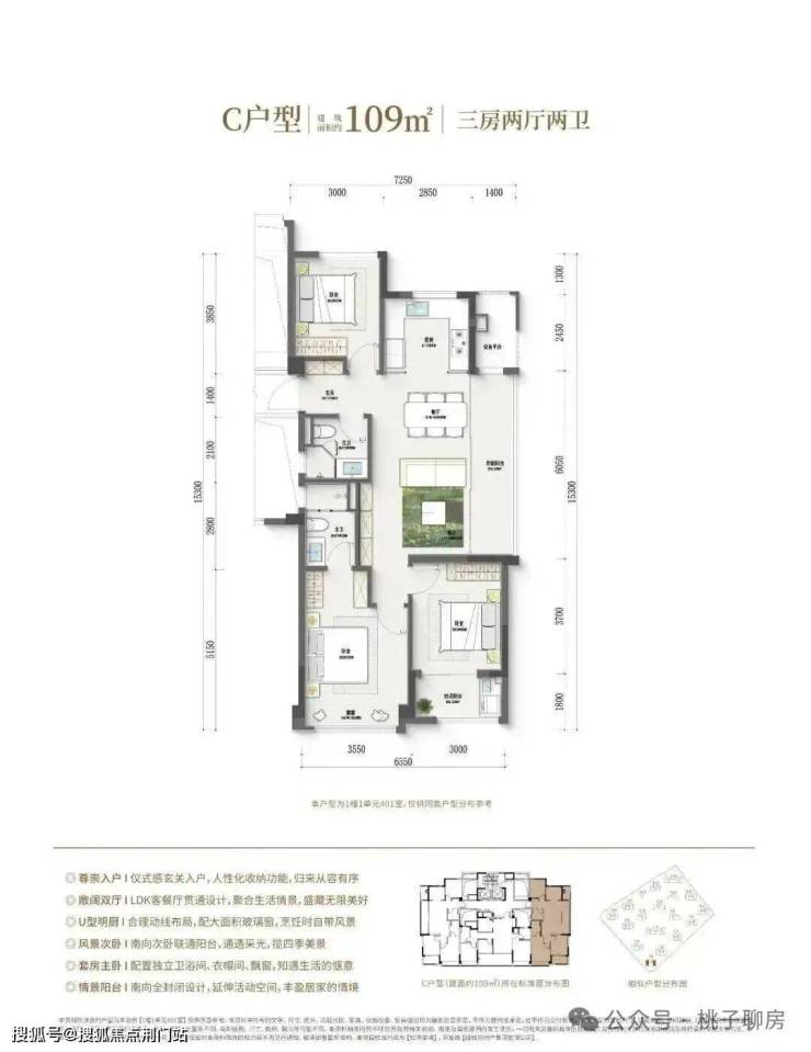 109方户型:三房两厅两卫,独立玄关,横厅边套,生活阳台+休闲阳台(全包),近13米采光