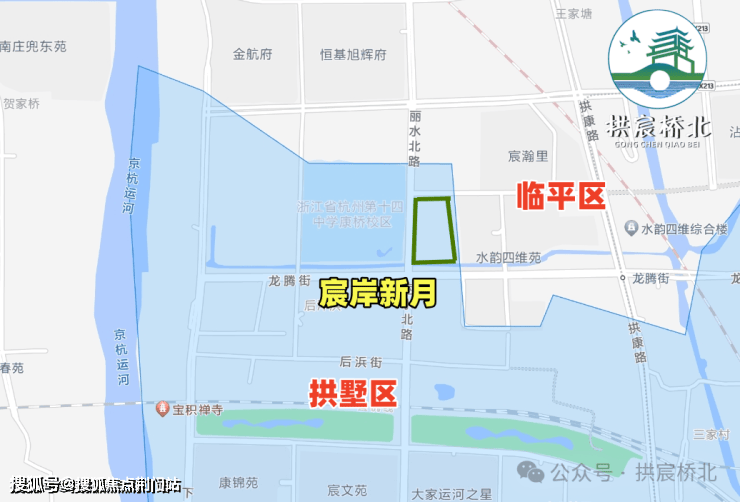 绿城·宸岸新月,也就是运河新城单元 GS1001-05地块,它位于拱墅区康桥街道龙腾街与丽水北路交叉口,步行距离在建的15号线龙腾街地铁站约650米。