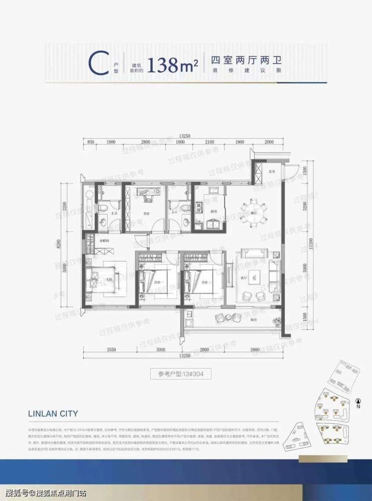 建面约138方户型:138㎡四房两厅两卫边套户型,则适合改善家庭的需求。空间格局动静分区,三个南向卧室,做到了「阳光平权」。卧室与客厅一同实现了四开间朝南,南向面宽超13米,同样也规划有双开间的「跑道阳台」。