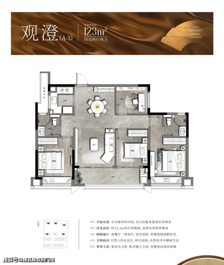 户型方面,本次首开的2幢高层(9、10号楼),主推建面约123㎡的中间套,以及建面约129㎡、139㎡的边套,均为四房两厅两卫全明格局。