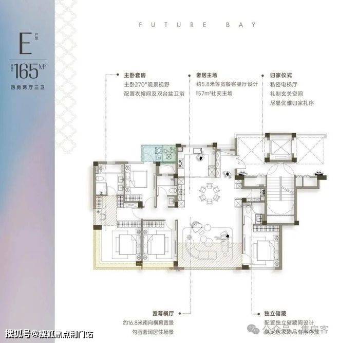 约165方户型,16.85米超大南向开间,超过市场所有同面积段产品;标配储藏间。