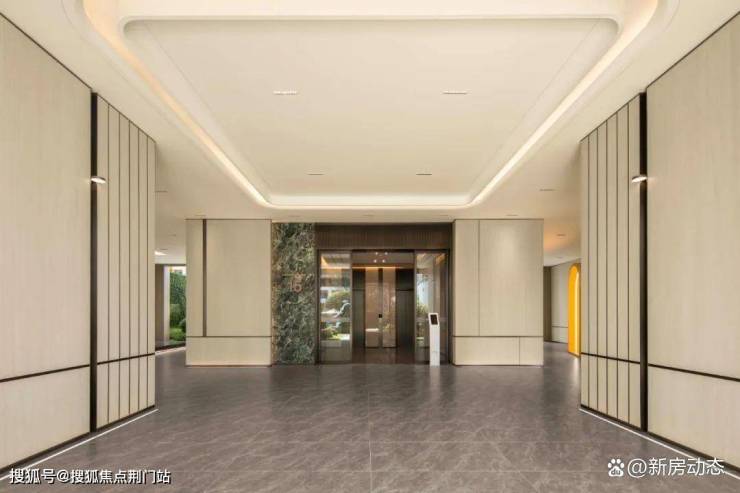 门庭。这里特指单元门庭,通高约4m,气势恢宏。大面积的金属屋檐外挑,彰显贵胄的同时,又扩大遮风挡雨的面积。进门左侧,色彩饱满的普拉达绿竖版镶嵌,美学传达与奢华品质相辅相成。进门后,又是大幅岩板上墙,气质拉满。