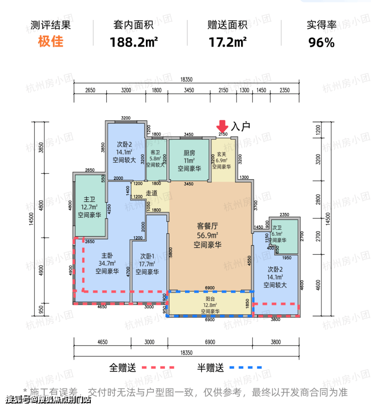 1.建面约145方3+1房2厅2卫:(注意下图客餐厅位置实际为x空间,交付时可能会隔成房间,所以也可以算4房)