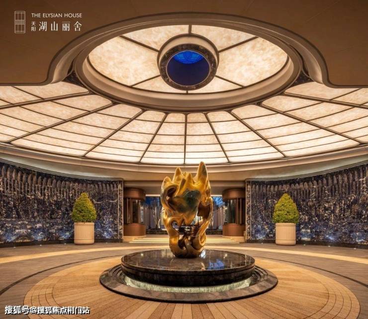 再如,中轴水景宛如展开的宝石匣:池畔蓝翡翠奢石采自马达加斯加稀有矿脉,被誉为石材界的"爱马仕"。冰蓝底色中游动着亿万年前形成的云母纹路,水池中的采光井镶嵌的西亚白冰玉,在透出朦胧光晕,与水面形成"镜中月、水中月、天上月"的奇观。