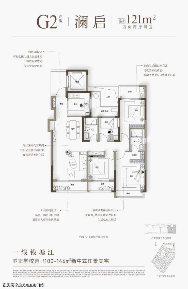 建面约146㎡的四房户型,全部南向面江,大部分楼层还可看到一线江景,是无数人心中的梦中情房。“类一梯一户”设计,私密性更好。其中横版四开间朝南+大方厅,一线南向面江,室内采光充足,视野开阔;竖版大边厅设计,主卧带有超长转角飘窗,可大尺度无死角欣赏钱塘江景。