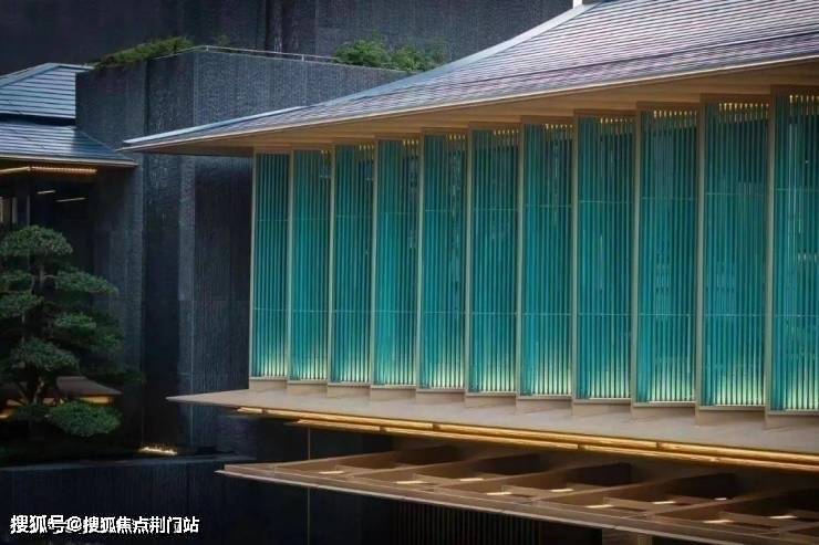 除了成片成片的品蓝色陶瓦+金属包边檐瓦,主入口形似波浪的直棂窗、会所的一长排立面屏扇,还借鉴了更高贵的秘色瓷(带绿的蓝色)。加上大片的灰蓝色玻璃,形成“蓝”之底色。