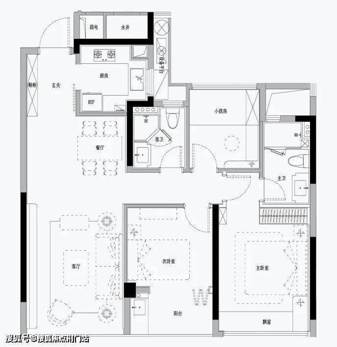 南向的次卧与公卫保持了最短动线,老人或孩子住这间,不但能享受“阳光平权”,洗漱起夜也非常方便。