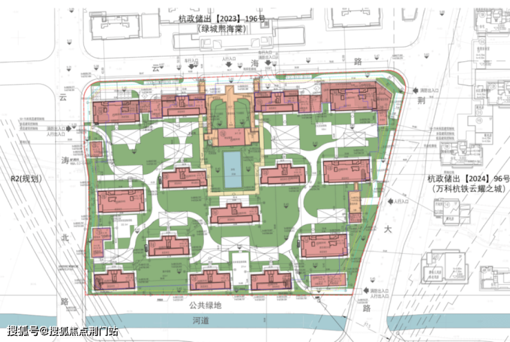 项目北面是绿城熙海棠,东面云万科云耀之城,南面是公共绿地、河道,居住氛围十分不错。主要的出入口也位于北、东两侧。