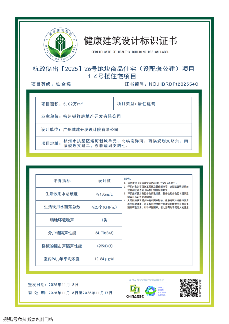 运河樾是目前杭州首座中国城市科学研究会认证的铂金级健康奢宅,以国家级权威标准打造,也是「好房子」健康标准中的最高等级。