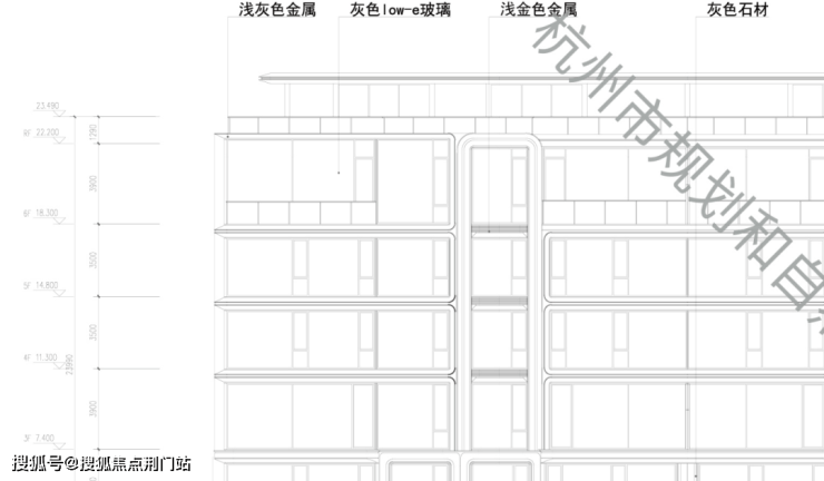 高层标准层高3米,立面由浅灰色铝板、石材、玻璃组合而成,时尚、大气。
