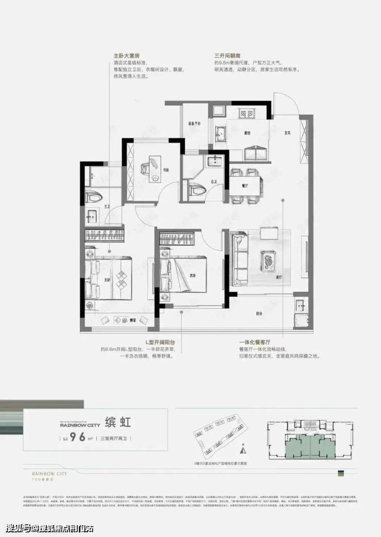 建面约96㎡的3房户型,总价不到200万,首付只要30万起,一体化餐客厅与两间起居卧室带来三开间的南向采光,想象一下,每个家庭成员每天起来,阳光透过大飘窗能第一时间照射进房间;南向L型双联阳台,既能当做日常生活晾晒阳台,也可以在这里种花养草,作为家里的绿植歇息空间。