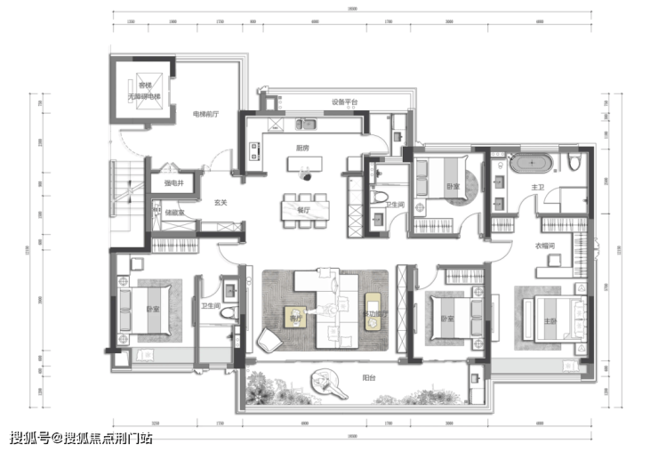 建面约117㎡户型,四房南厅设计,餐客一体,南向面宽约10.1米,兼顾了功能和尺度。