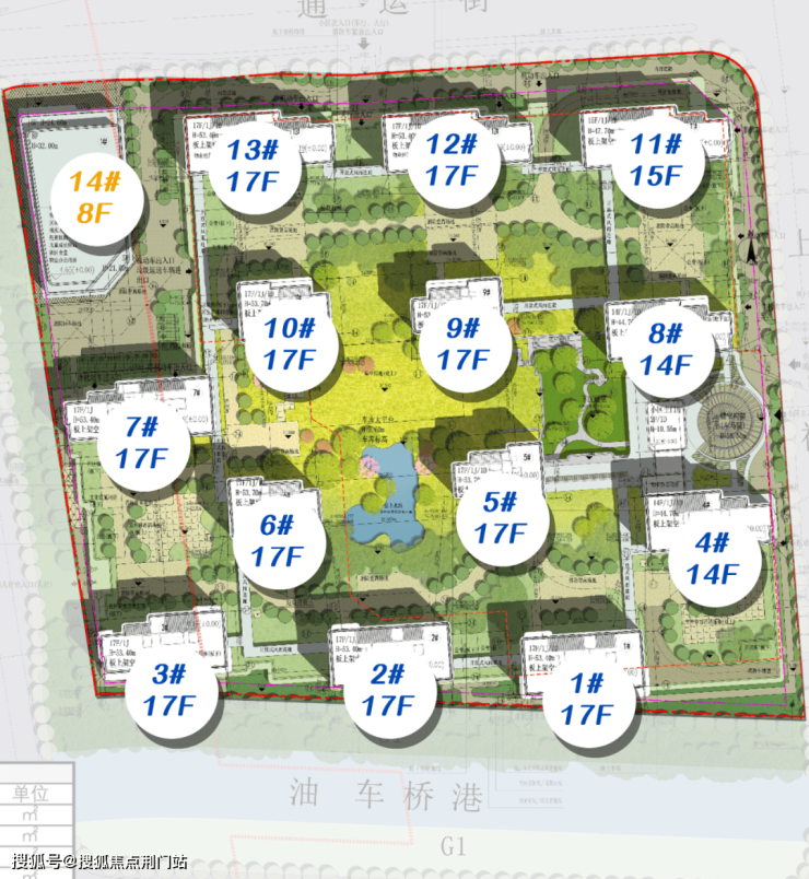 项目共规划了13幢14-17F高层,包含2幢14F、1幢15F和10幢17F,以及1幢8F公建配套。