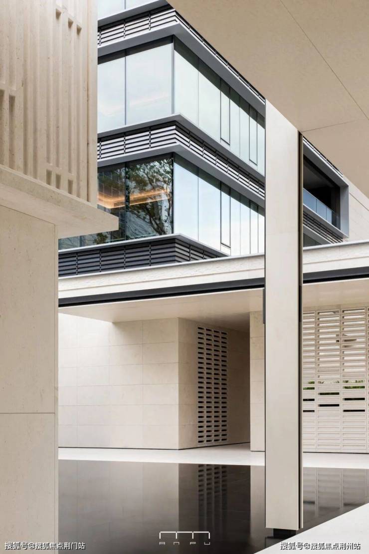 高层外立面有石材铝板陶砖玻璃幕墙,既有铝材线条的轻盈挺拔、又带着陶釉面温润多变的光泽和石材的厚重沉稳,视觉效果具有丰富的层次感和独特的艺术张力。