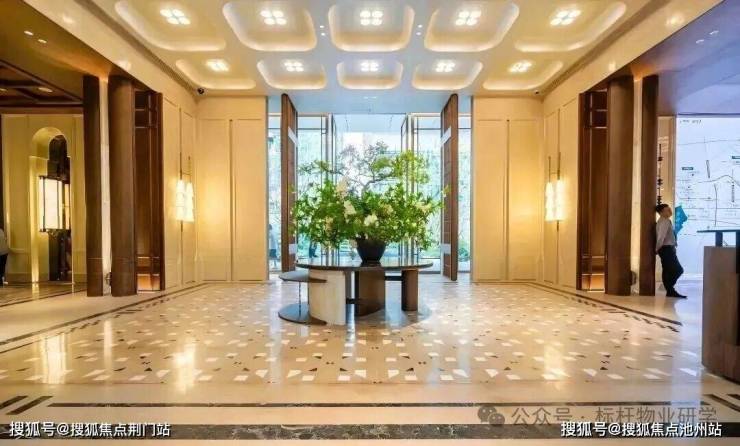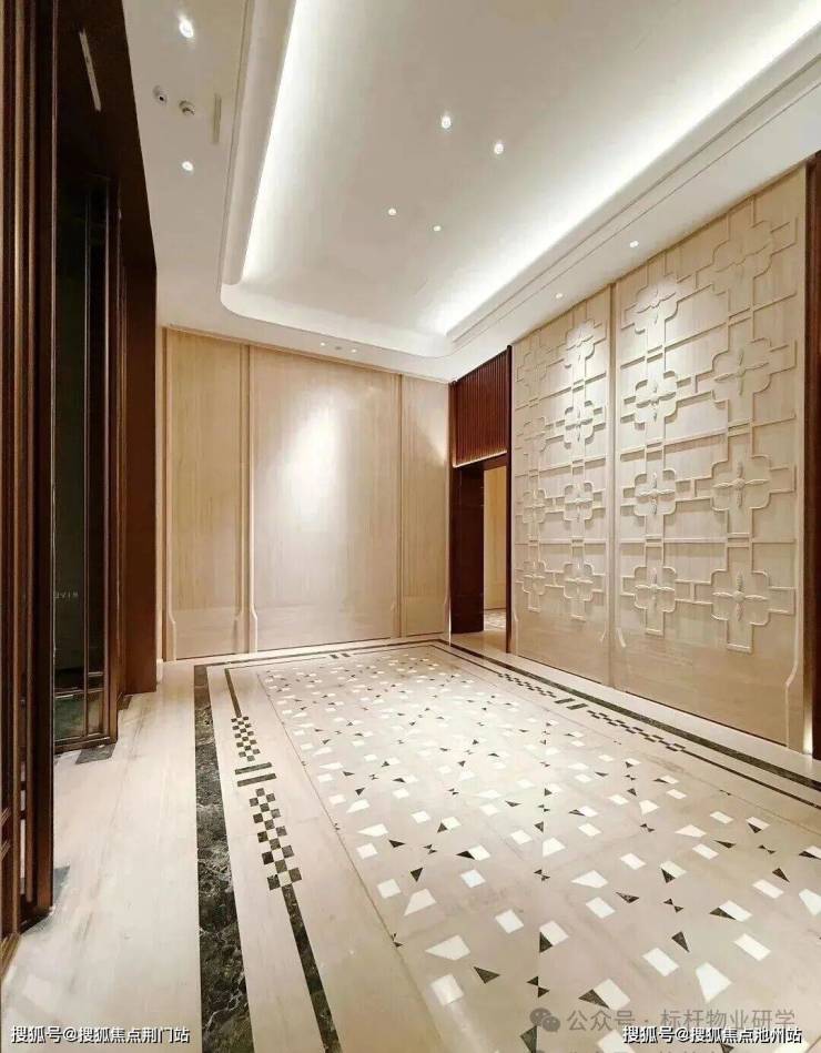 玉树门庭,传承芝澜月华的优雅入口,墙面采用贝金米黄石材,高达7米的玉树构架以UHPC材质精心打造,柱身巧妙嵌入蓝翡翠玉石与亚马逊绿奢石,尽显奢华与精致。