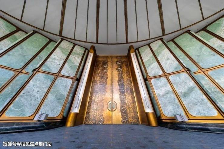 比如约56x11.5米的超尺度门庭,顶部以杭州折扇为造型灵感,寓意“藏风聚气”;四周还有12片巴西进口的百达翡绿奢石雕琢的玉石屏风;中间还有约9.6x5.3米的巨幅铜门,是由非遗传承人朱炳仁手工锻打,再现钱塘潮涌的磅礴气场