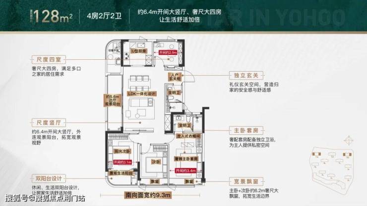 约6.4米开间大竖厅,约9.3 米南向观景面,