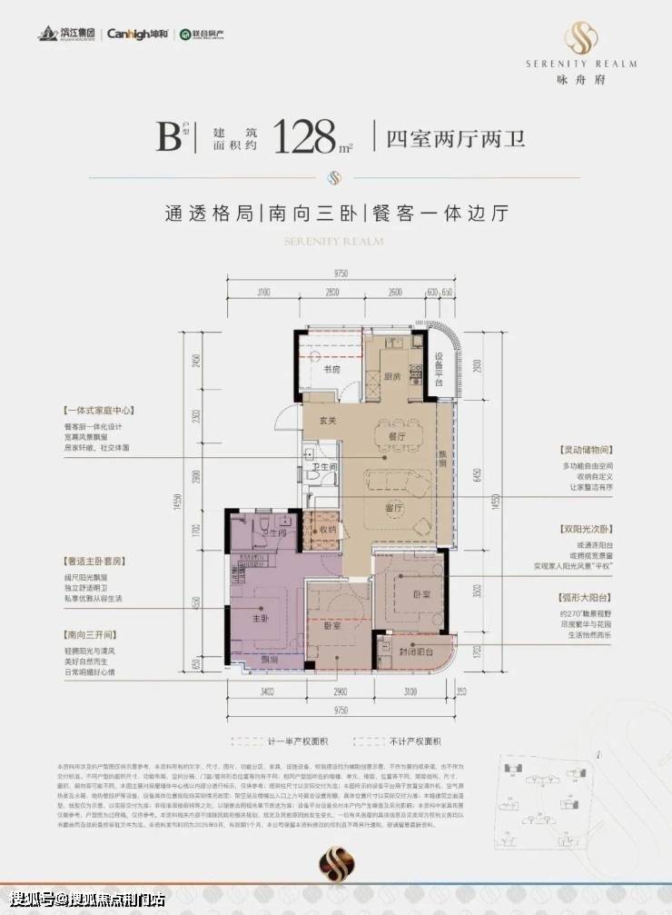 建面约128㎡边套户型,4房2厅2卫,两梯三户,配有储存间,含赠送得房率约88%左右。