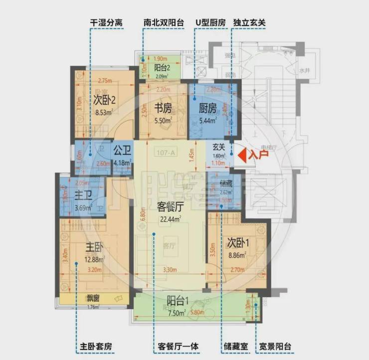 2.全四房户型。最小户型107㎡都做了四房两卫+独立储藏间。