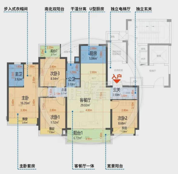 1.高得房率、全边套。洋房一梯两户,小高层类一梯一户,没有中间套、没有连廊。