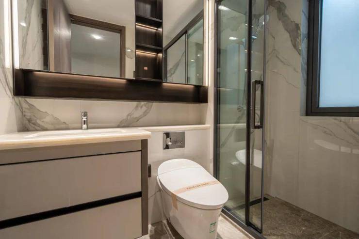 主卫配了酒店式壁挂智能马桶,市面上很少见。卫浴间配置了线条式暖风机、汉斯格雅花洒+顶喷、自带加热除雾功能的通长镜柜、天然大理石台面,太奢侈了。