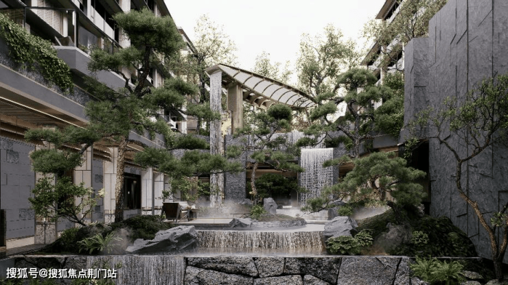 以千年运河文化为魂、宋韵山水为骨,打造 “立体山水峡谷园林”。核心围绕 “四处运河之源” 展开:形态之源——以运河流淌之形贯穿住宅区,同时跌水联通上下三层立体下沉空间,模拟运河自然流势;意境之源——模拟“宋韵十大雅集”定制十大水岸生活场景,古今生活形成时代对话;文化之源——融入杭州传统文化于定制铺装、宅印符号等细节处,让运河文化实现生活美学转译的跃迁;空间之源——借鉴宋画《四景山水图》中的“坊下檐、檐下廊、林中亭、水畔居”等,构建多重江南折叠院落。以江南古典园林的设计理念展现“以小见大”的空间层次,转译杭州枕水而居一半烟火,一半诗意的立体宋韵长卷。