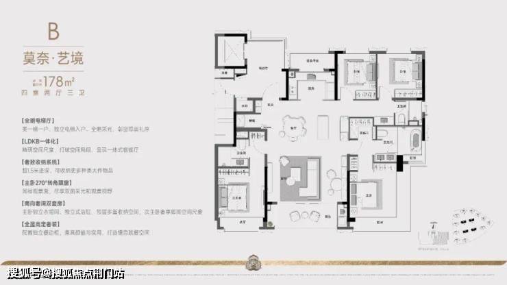 最先亮相的建筑面积约145㎡南厅户型,还带独立电梯厅。主卧的270°转角飘窗,以罕见的极窄边框技术,叠加超大面玻璃,尽享无边界的视野采光。