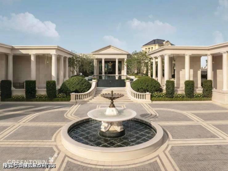 绿城·溪径恒庐做出了一条约200米的沿街界面:从楼盘大门口的喷泉广场,到沿街柱廊,一直贯通到「雅典卫城」会所。你一看这条「大门-柱廊-会所」的沿街界面就知道,这是一个价值非凡的低密楼盘。