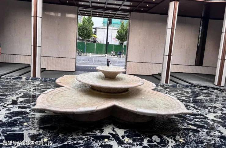 从大门开始卷起,贝金米黄石材+两侧叠水呼应,6根紫水晶+普拉达绿奢石柱阵(紫气东来,六六大顺);头顶为仿铝板吊顶,丁香LOGO铜制格栅左右对称