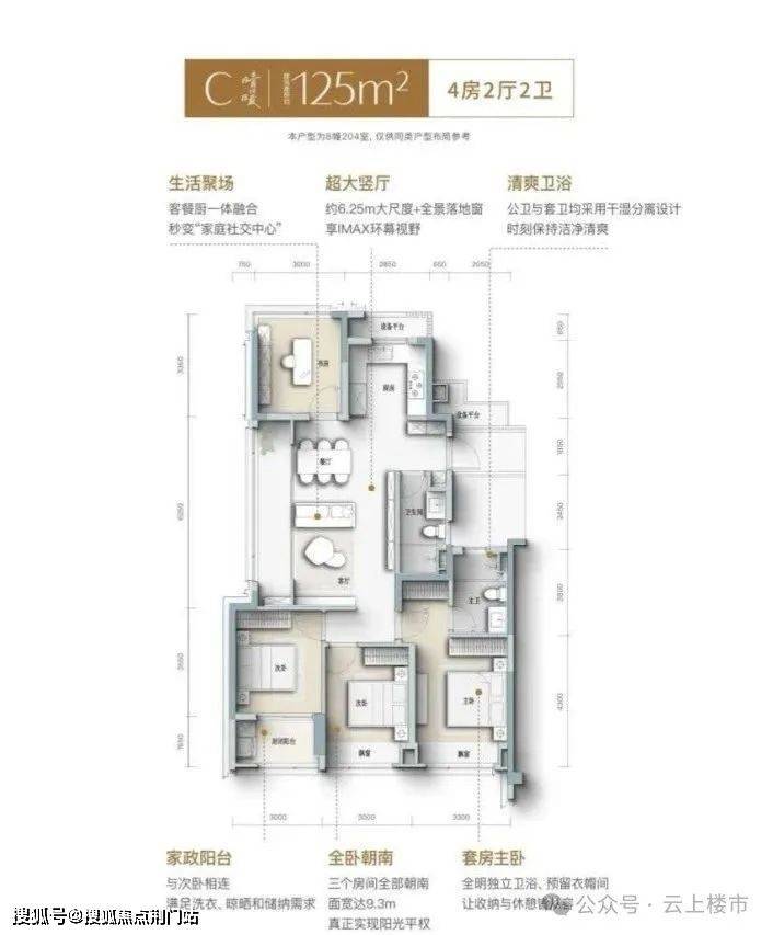 125㎡户型以 “6.25 米横厅 + 三房朝南” 成为性价比担当。U 型厨房与餐客厅联动,备餐时零食、餐具可 “丝滑归位”;6.25 米超宽横厅搭配全景落地窗,带来 IMAX 级的采光与视野体验。三房朝南设计让每个卧室都充满阳光,主卧为套房设计,预留衣帽间空间,次卧紧邻生活阳台,洗衣琐碎可轻松隐藏。
