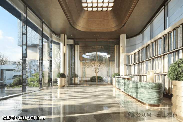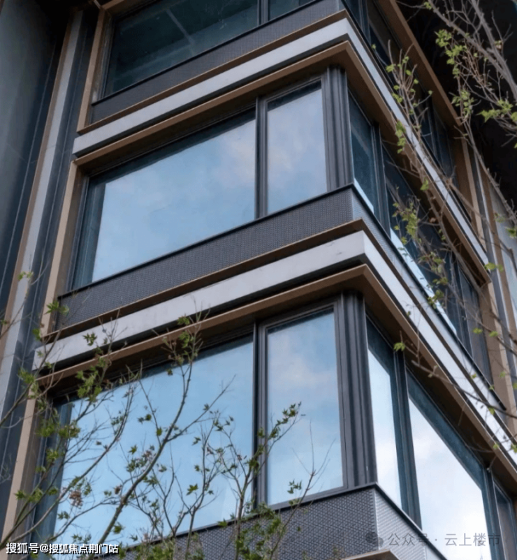 项目外立面沿袭锦庐系经典公建风貌,精选四面铝板与全景玻璃结合,统一封包阳台,打造出通透精致的现代感。底层采用浅色调天然石材,融入圆弧设计元素,四边以高品质金属铝板环绕,香槟金与深灰的配色尽显高贵气质。